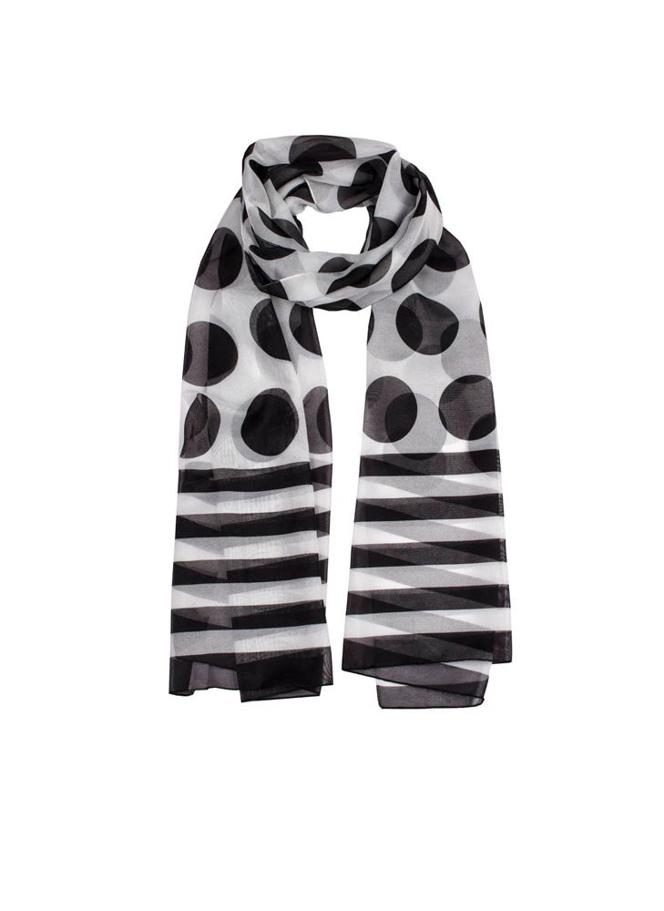 This lightweight voile scarf packs a punch with our contrasting spot and stripe pattern.