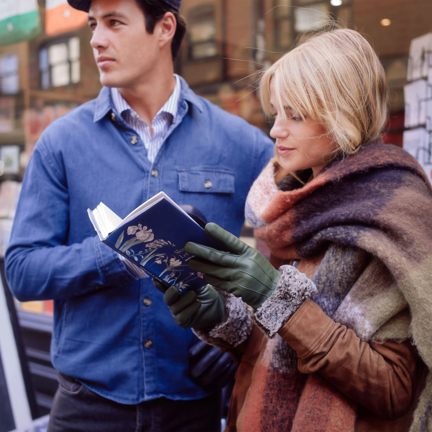 Women’s Touchscreen Three-Point Lined Leather Gloves With Faux Fur Cuffs