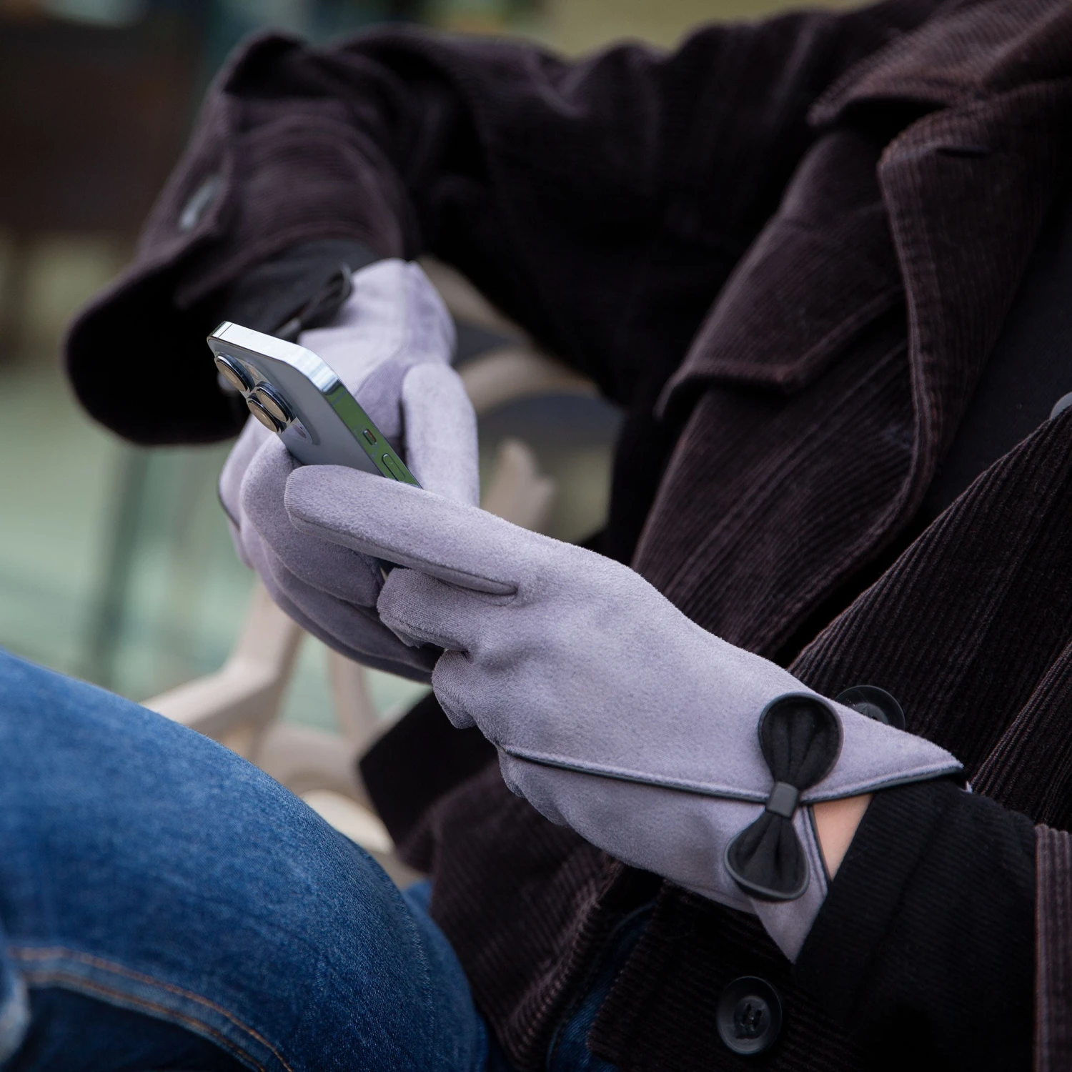 Keep it cute when cold weather hits thanks to our faux suede gloves. Designed with a pretty bow and piped trim in contrasting colours, these elegant gloves are packed with irresistible charm. The super-soft faux suede features touchpads on the index finger and thumb which enable you to use your mobile phone without having to remove your gloves. Fashionable and phone-friendly, these gloves are also lined with velour to keep hands warm when temperatures cool. Perfect for changing seasons and stylish autumn layering.